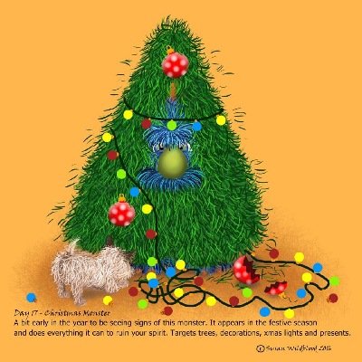 To wish you a monstrous holiday in 2017 we display this Christmas Monster, the creature of Susan Wildblood of Paraparaumu. The South Island native has written, illustrated and published a 50-page book, Living With Monsters, for children 7-14. Susan and husband Mike's own two children have already grown out of this aggravating life stage.